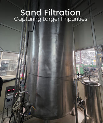 Next, the water flows through our advanced sand filters. These multi-layered beds of fine sand expertly trap larger suspended particles, sediments, rust, and other visible impurities, significantly improving the water’s clarity and preparing it for subsequent stages.